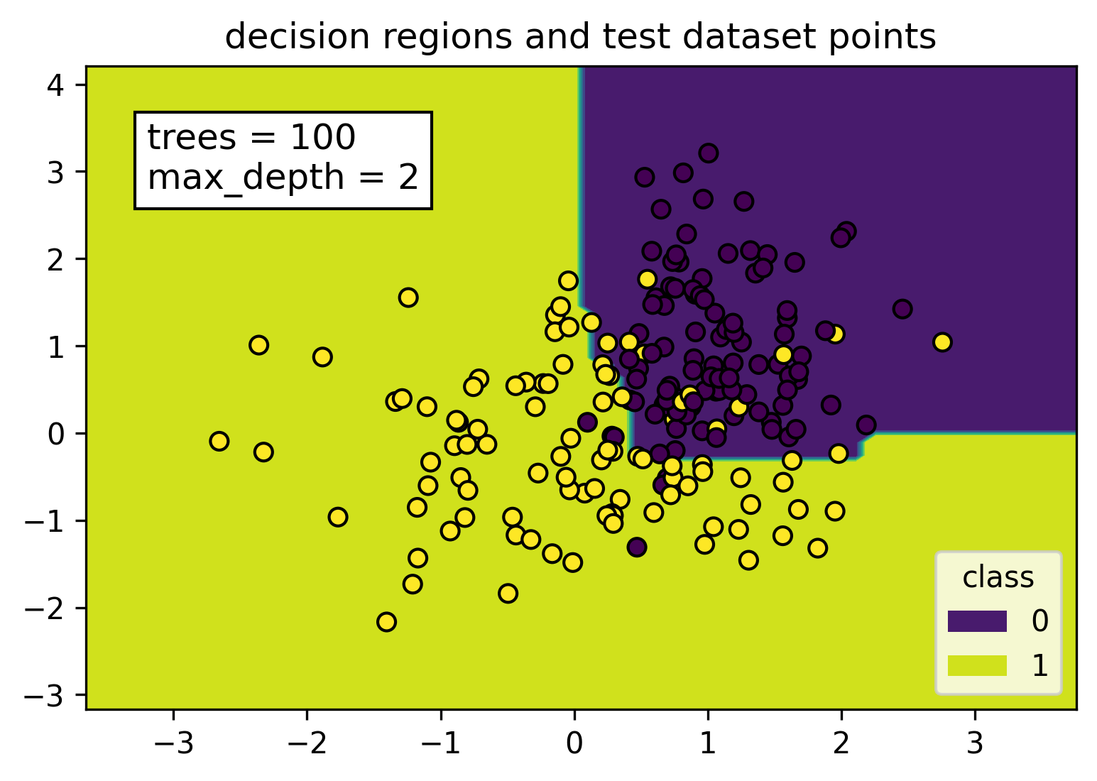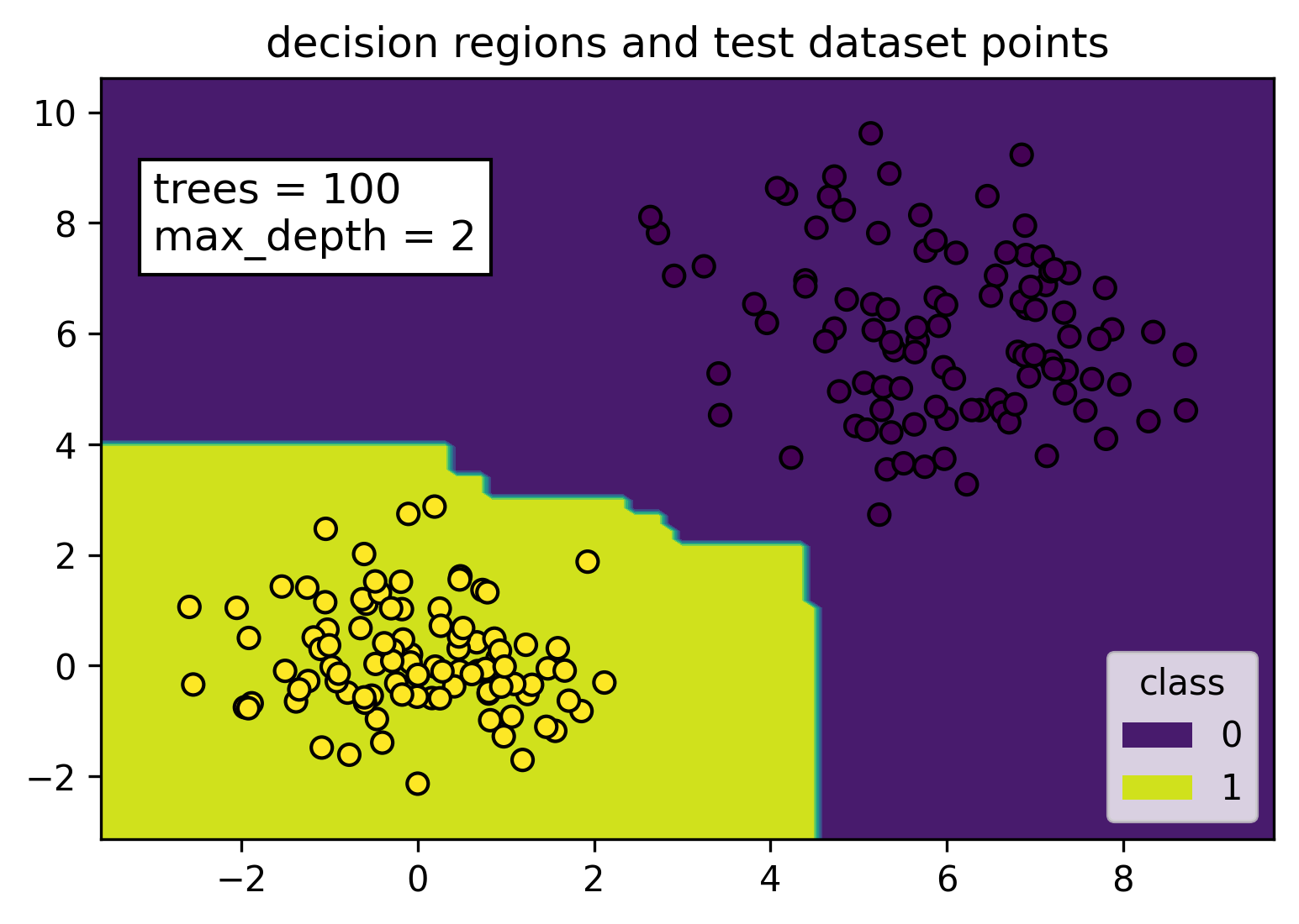 We can see from the figure that when the data is easily separable, the random forest model is going to have close to zero or zero error on the training set, but the resulting separator will not be overfitted. The yellow and purple decision regions were constructed with the training dataset. All the yellow points (class label = 1) from the test dataset fall nicely in the yellow decision region, while all the purple points (class label = 0) fall within the purple decision region.