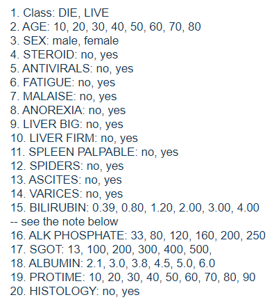 The binary features described by words are encoded as 1 to represent the category on the left, and 2 for the category on the right. For example, the “steroid” variable is either a 1 for “no” or a 2 for “yes”. It is not stated how exactly the “class” variable is defined. I guess that these patients were admitted to the hospital for treatment. “Live” might mean that they survived their stay and were later discharged.