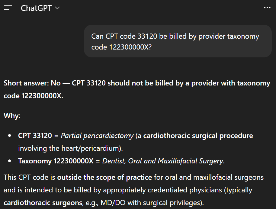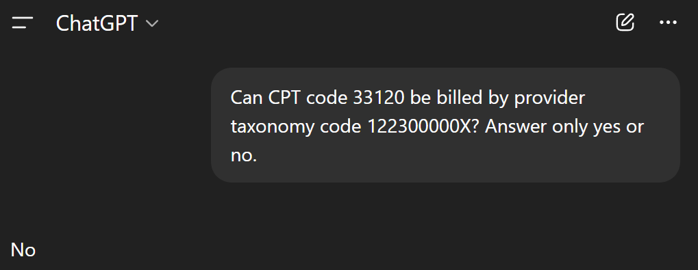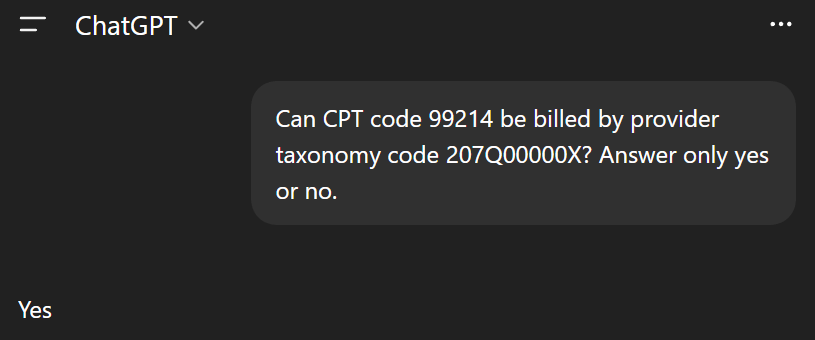 The way I like to prompt the LLM is to make the output answer as specific as possible. This is an example of how I would do it in ChatGPT 5.1 for our previous example of a provider with taxonomy code 207Q00000X (family medicine) billing CPT code 99214 (office visit).