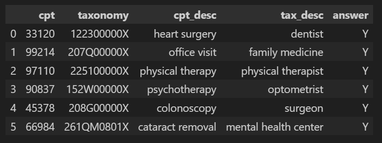 One advantage of restricting the LLM to highly specific yes or no answers is that we can compile a list of CPT and taxonomy code pairs with known labels and test the accuracy of the system as if it is a classification model.