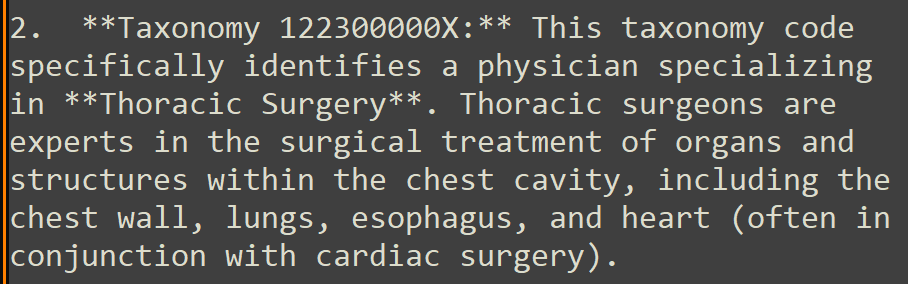 We can easily automate this prompting process for a large list of CPT and taxonomy code combinations. Google Gemini has a free tier with API access, which is what I will be using to demonstrate this. Below is an example.