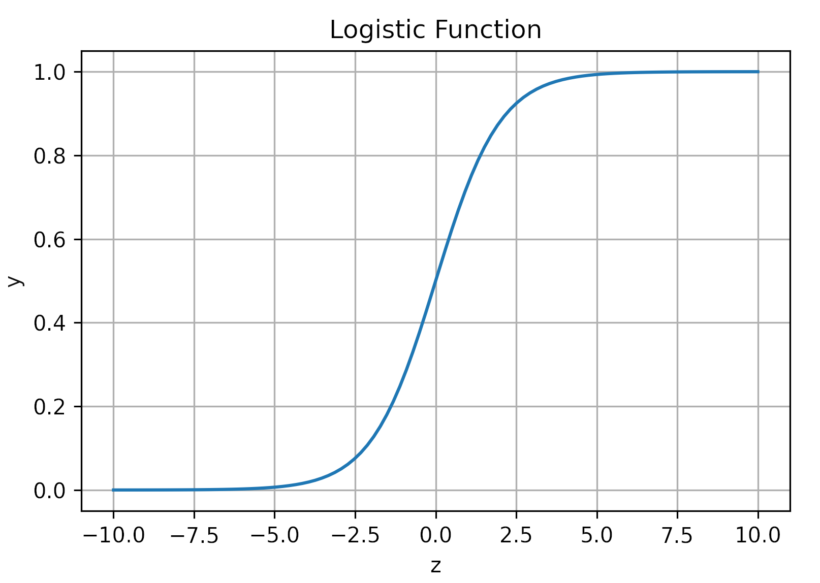 Where \( \hat{p}_i \) is the model’s estimate of the probability that \( y_i = 1 \). This estimate is guaranteed to lie between \( 0 \) and \( 1 \). A simple plot of the function \( y = \) on \( z \in [-10, 10] \) demonstrates why this is true.
