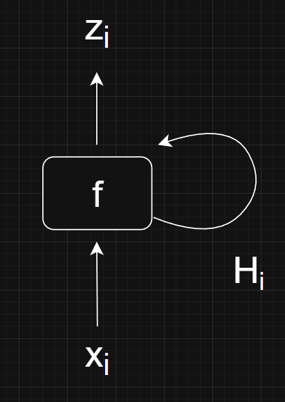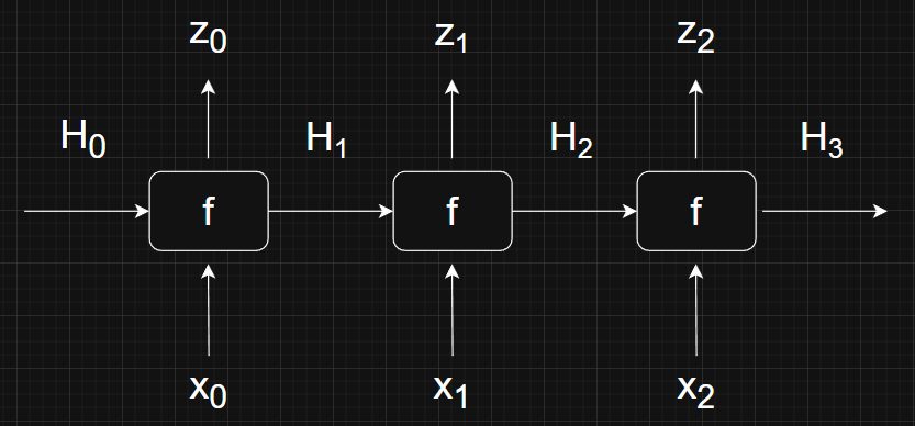 The idea behind RNNs is to start with the first element \( x_0 \) and a vector \( H_0 \). The vector \( H_0 \) is known as the hidden state and can be initialized with all zeros. Then, have function \( f \) produce an output \( z_0 \) and hidden state \( H_1 \). This process is repeated for each element in the sequence, using the hidden state produced during the previous step as input to the next step.