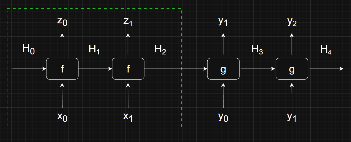 The portion that is inside the dotted green box is the encoder part of the architecture. You might have noticed that this is identical to a figure shown earlier. \( f \) is just a regular RNN that takes in the input sequence then eventually outputs a final hidden state \( H_2 \).