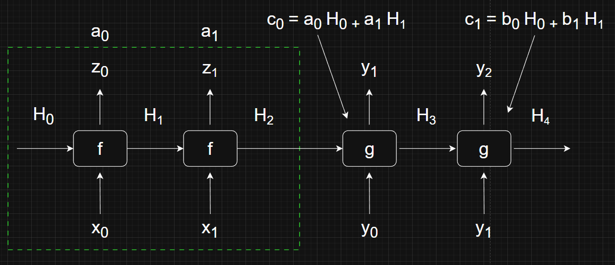 The key difference is really just the inclusion of the context vectors \( c_i \). Here, the decoder RNN \( g \) uses the final hidden state \( H_2 \) from the encoder, the beginning of sequence/sentence token \( y_0 \), and the context vector \( c_0 \) to generate next token \( y_1 \). That is, instead of \( g(y_0, H_2) = y_1 \), we instead have \( g(y_0, H_2, c_0) = y_1 \).