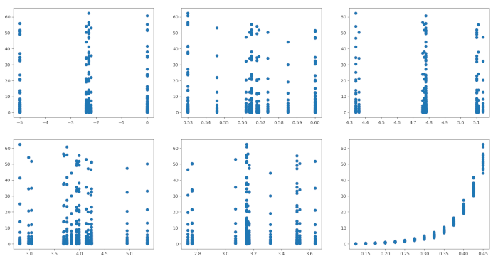 While some of these variables look like good candidates for splitting the data set into clusters, only the bottom right plot (\( Y \) vs Froude number) shows some potential for a simple linear regression model. The relationship shown in the scatterplot is clearly not linear, but we can apply a logarithmic transform to the \( Y \) variable to get a more linear looking scatterplot.