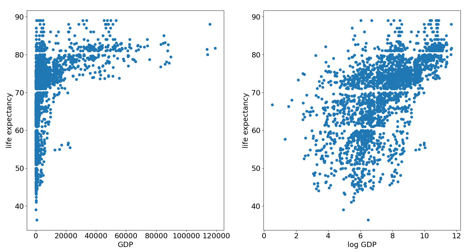 Let’s take a look at the scatterplots of GDP and life expectancy.