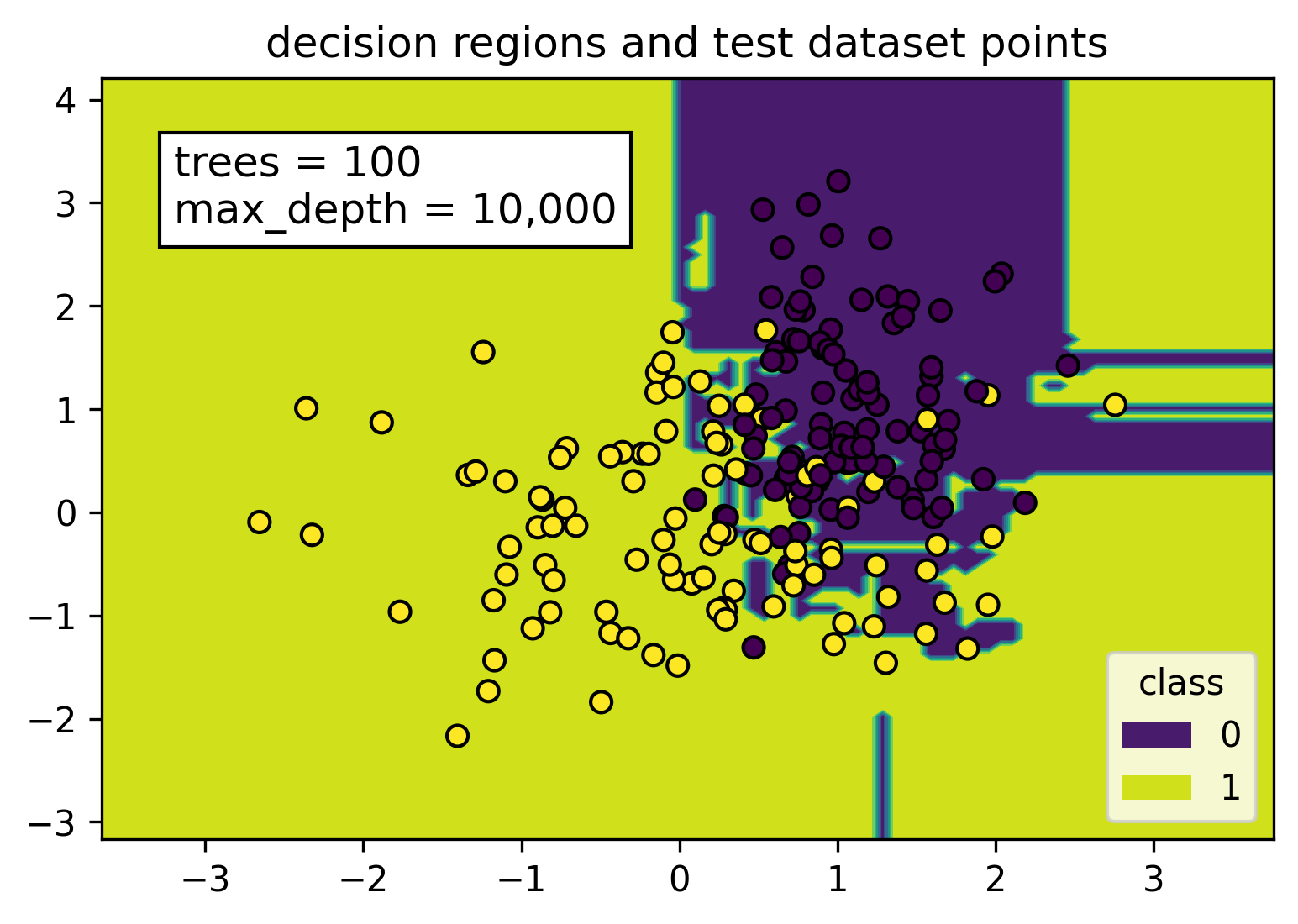 By setting the max depth parameter to 10,000, each tree in the random forest model will keep splitting until each node is pure. As seen in the figure, this caused the decision region to be split up into tiny, irregular chunks. These tiny pieces are tailor-made for points in the training set, but there is really no reason why they would help classify points from the test dataset.