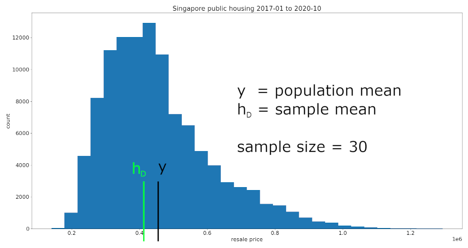 To illustrate what this scenario looks like in real life, I will pretend that a set of data on public housing resale prices in Singapore is the population \( P \), from which I took an IID sample \( D \) of \( n = 30 \) data points.